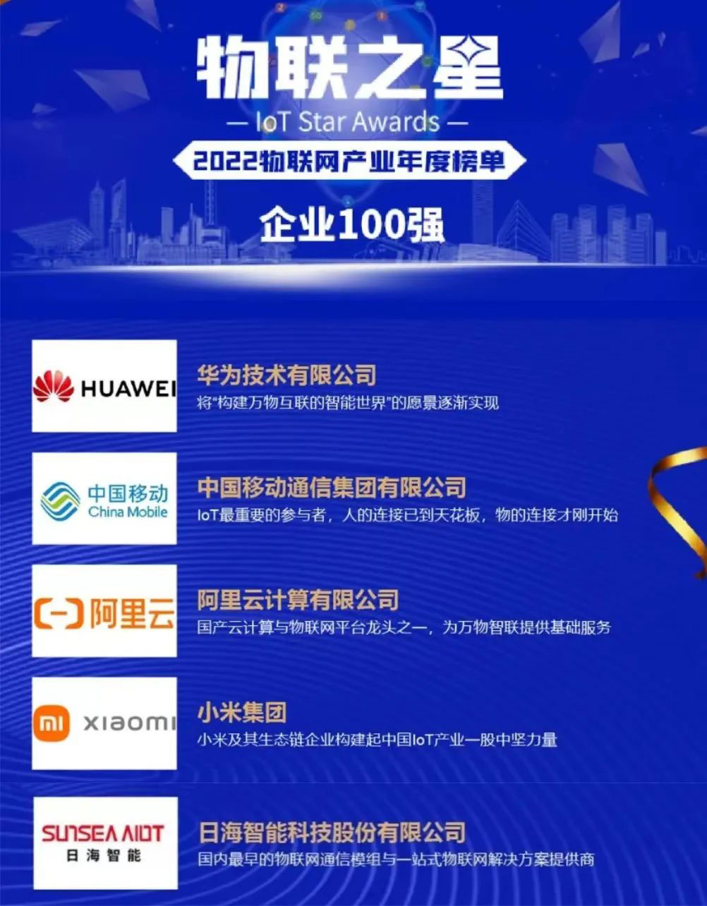 该年度榜单以公司业绩规模与人员规模较大且稳定、近三年业绩规模与净增长率表现良好、研发投入金额与占比较大并有行业影响力的新品发布、同时在物联网领域行业地位突出为四个评选标准进行严格、客观评选。飞速发展的物联网行业群雄并起,优秀企业不断涌现,银河公司智能脱颖而出,与华为、中国移动、阿里云计算等知名企业齐头并进、共同成为中国物联网企业百强,背后是近三十年的实力积淀。